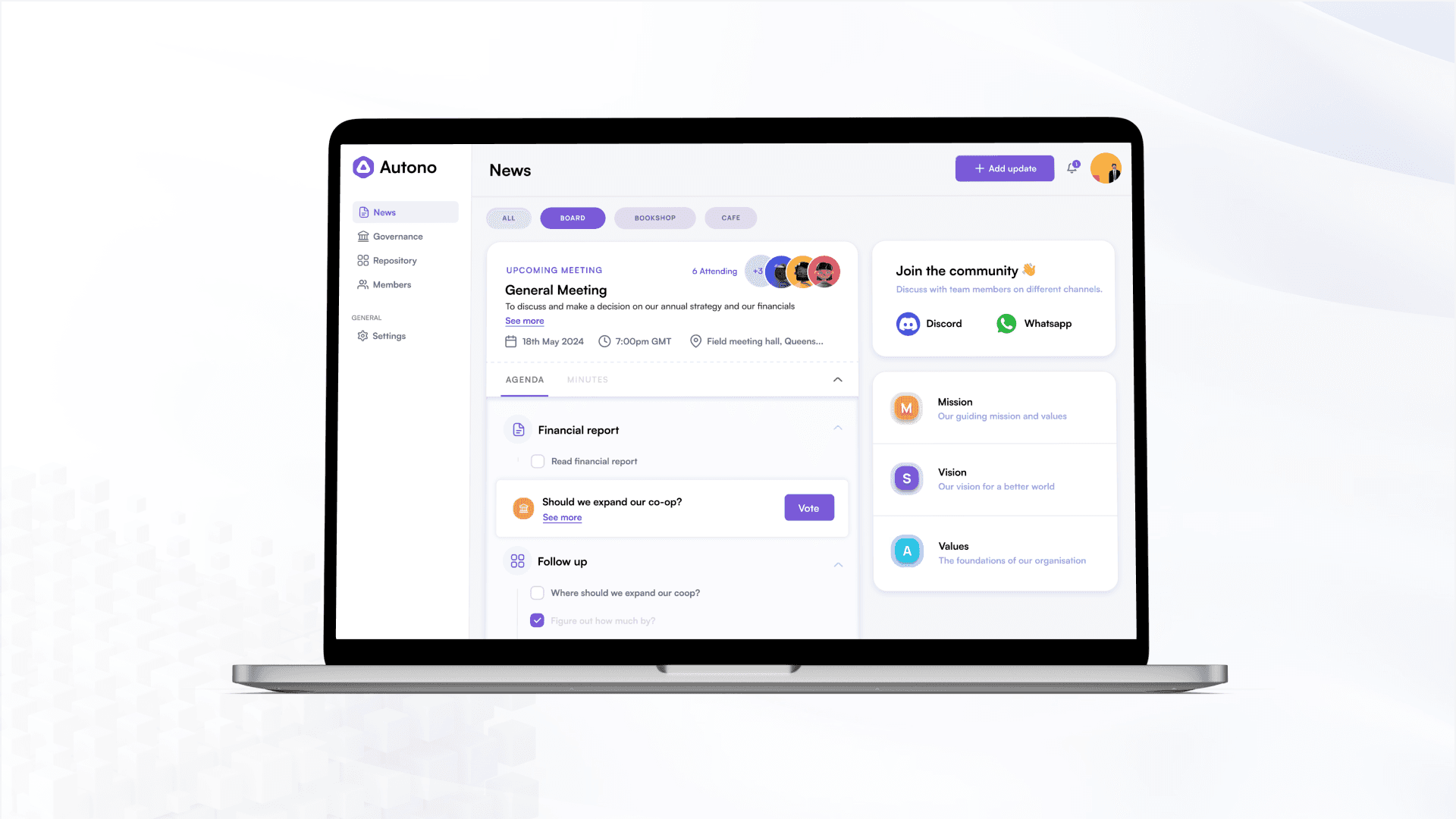 To close out my research, I onboarded a client with 40,000 members to test governance at scale. User interviews with this client confirmed Autono's product-market fit. Autono’s next step is to scale the platform for medium and large social economy organisations.