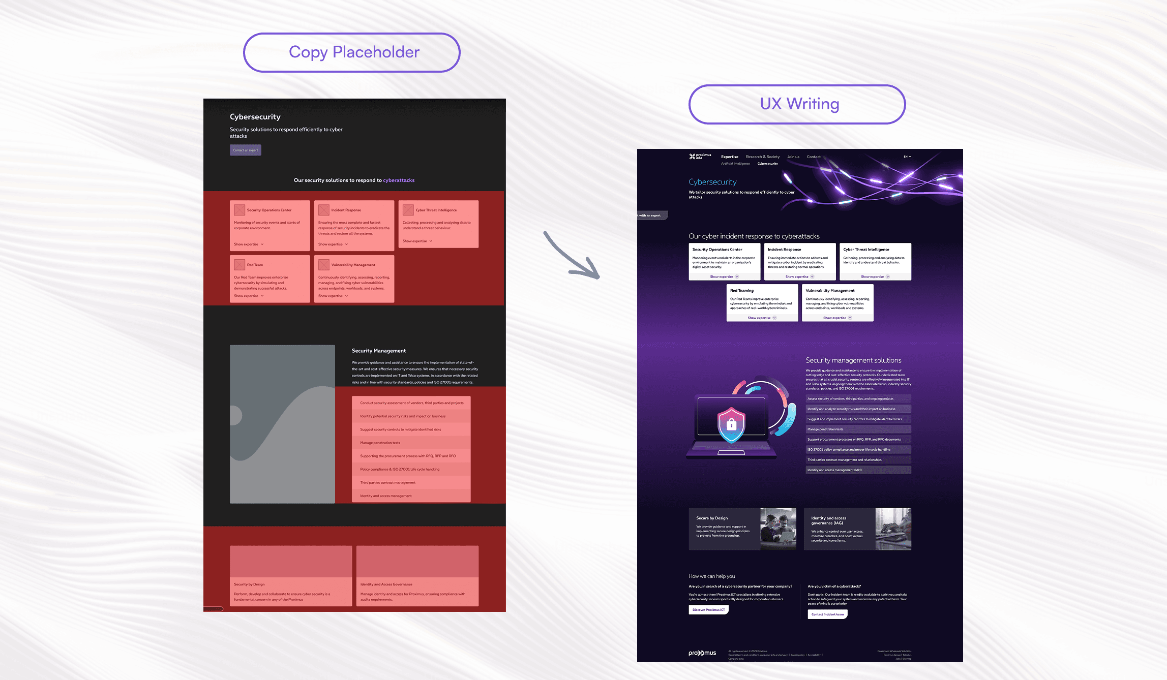 I drafted the copy in US English, following Proximus’s editorial guidelines for tone, spelling, and punctuation. I incorporated relevant AI and cybersecurity terminology, such as "deep dive" and "neural geek," and prioritised accessibility by adding alt text for images and providing a gender-neutral language guide for the English version.